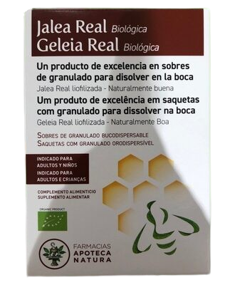 Un producto de excelencia en sobres de granulado para disolver en la boca. Jalea real liofilizada. Naturalmente buena. Indicada para adultos y niños. Del mundo de los productos de la colmena a los sobres de granulado bucodispersable monodosis, la Jalea Real Biológica aúna la practicidad de la administración en cualquier momento del día y todos los beneficios y la calidad del alimento exclusivo de la abeja reina. Adecuada para todas las edades y especialmente para los niños, la Jalea Real Biológica se disuelve instantáneamente en la boca y, en las dosis recomendadas, es capaz de garantizar un aporte diario equivalente a 500 mg de Jalea Real fresca. Una materia prima biológica pura e incontaminada, fruto de un proceso productivo certificado y controlado a lo largo de toda la cadena productiva (Reg. CE 834/2007) que, gracias a la liofilización, conserva intactas todas sus características originales incluso a temperatura ambiente y sin la agregación de excipientes. El buen gusto del producto hace que sea agradable de tomar, sobre todo para los más pequeños.