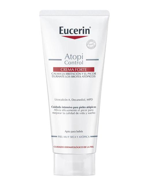 Eucerin AtopiControl Crema Forte es una crema de uso corporal y facial indicada para el tratamiento en fases agudas de la dermatitis atópica. Se puede usar como tratamiento o como coadyuvante con corticoides, y está específicamente formulada para pieles secas atópicas durante estas fases críticas. También actúa como coadyuvante al tratamiento farmacológico. Esta crema es apta para bebés a partir de 3 meses. Su formula calma la piel irritada, mejora el eritema y alivia el picor del brote agudo, actuando frente a los 5 signos del brote agudo: alteración de la barrera, sequedad, infección, inflamación, prurito y rascado. Frena los brotes agudos que presentan picor gracias a su tratamiento calmante y a los ingredientes activos: AGE Omega 6 12% (que restaura la barrera cutánea), Ceramida 3 (restablece la barrera cutánea y trata la sequedad), Licocalcón A (antiinflamatorio), Decandiol (antiséptico) y Mentoxi-propanediol (anti-picor). Está exenta de perfume, sin colorantes artificiales y sin alcohol, y no contiene corticoides. Su tolerancia cutánea y eficacia han sido demostradas en estudios clínicos.