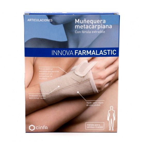 La muñequera metacarpiana Innova es válida para ambas manos y presenta una doble acción: 1- Prevención: si se lesiona la muñeca con facilidad y tras inmovilizaciones por lesiones traumáticas. 2- Sujeción: en caso de dolor inespecífico, esguinces o tendinitis que no precisan inmovilización, así como en casos de síndrome de túnel carpiano.